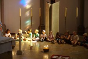 Die feierliche Segnung fand in der Herz-Jesu-Kirche statt – ein Ort voller Licht, Klang und Gemeinschaft. Unter der bunt strahlenden Kuppel nahmen die Kinder im Kreis Platz, begleitet von ihren Eltern und Pädagoginnen. Die Stimmen aller erfüllten den großen Raum beim gemeinsamen Singen und schufen eine Atmosphäre voller Wärme und Nähe.