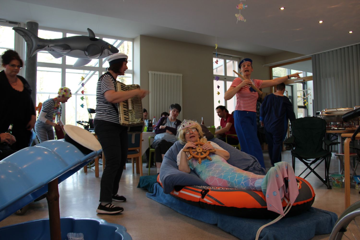 Der Bademeister begrüßte die Gäste und sorgte mit seiner Trillerpfeife für Ordnung. Danach ging es auf hohe See. Die Matrosen ruderten mit ihrer Meerjungfrau im Boot auf die Bühne und brachten alle zum Lachen und Staunen. Anschließend wagten sich die Angler auf Fischfang und zogen nach vielen vergeblichen Versuchen endlich einen riesigen Krebs an Land.