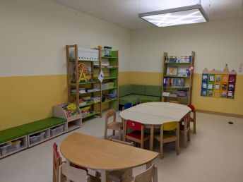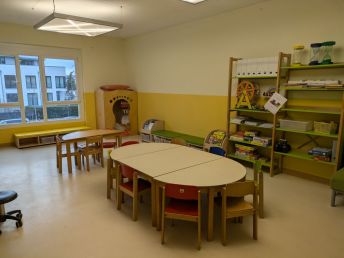 Die Vorschüler erleben hier Ruhe bei der Arbeit und erhalten verschiedene Materialien zum Entdecken. Auch für die Begleitung von Kleingruppen oder zur individuellen Einzelförderung ermöglicht die neue Raumgestaltung Rückzugsmöglichkeiten. Den Kindern stehen diverse Bücher, Materialien zur Sprachförderung, Wahrnehmung und Konstruktion zur Verfügung. Eine große Auswahl an Tonie-Hörspielen unterstützt zusätzlich das Hör-und-Sprach-Verständnis. Das Spiegelhaus steht den Kindern als Rückzugsort sowie zur Entspannung zur Verfügung.