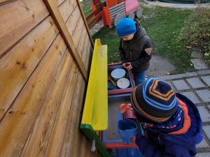 Eine Matschküche im hinteren Garten lädt zum gemeinsamen Kochen und Backen von leckerem Sandkuchen oder Matschsuppen ein. Das Arbeiten mit dem weichen Sand oder Matsch in sozialen Interaktionen ist für alle Kinder besonders interessant.