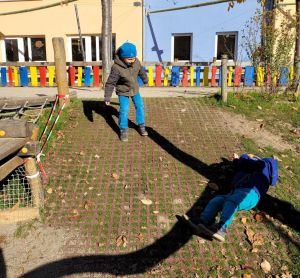 Die alte Steigrampe am Klettergerüst war in die Jahre gekommen und musste nun weichen. Das feste Rasengitter gibt den Kindern Halt beim Erklimmen der Steigung, neue Perspektiven beim Passieren nach unten und eine grüne Fläche für unseren Garten.
