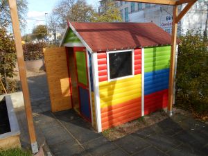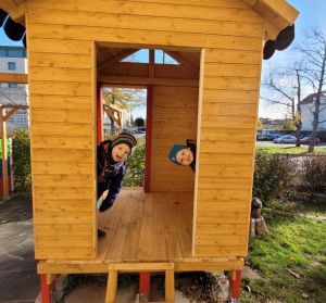 Das neue Gartenhaus dient als Ruhe- und Rückzugsort im Außenbereich. Das integrierte Spielmaterial regt zu weiteren Spielen im ruhigen Haus „Villa Kunterbunt“ an. Die Tafel an der Hauswand lässt kreativen Raum zum Malen und Gestalten.